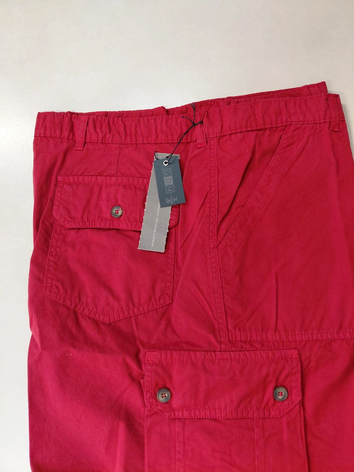 Questi pantaloni corti uomo GDM, in puro cotone rosso, uniscono comfort e praticità grazie ai tasconi ampi. Ideali per chi cerca stile casual con funzionalità, la taglia IT 60 garantisce una vestibilità comoda. Nuovi con cartellino, sono perfetti per un look estivo vivace.